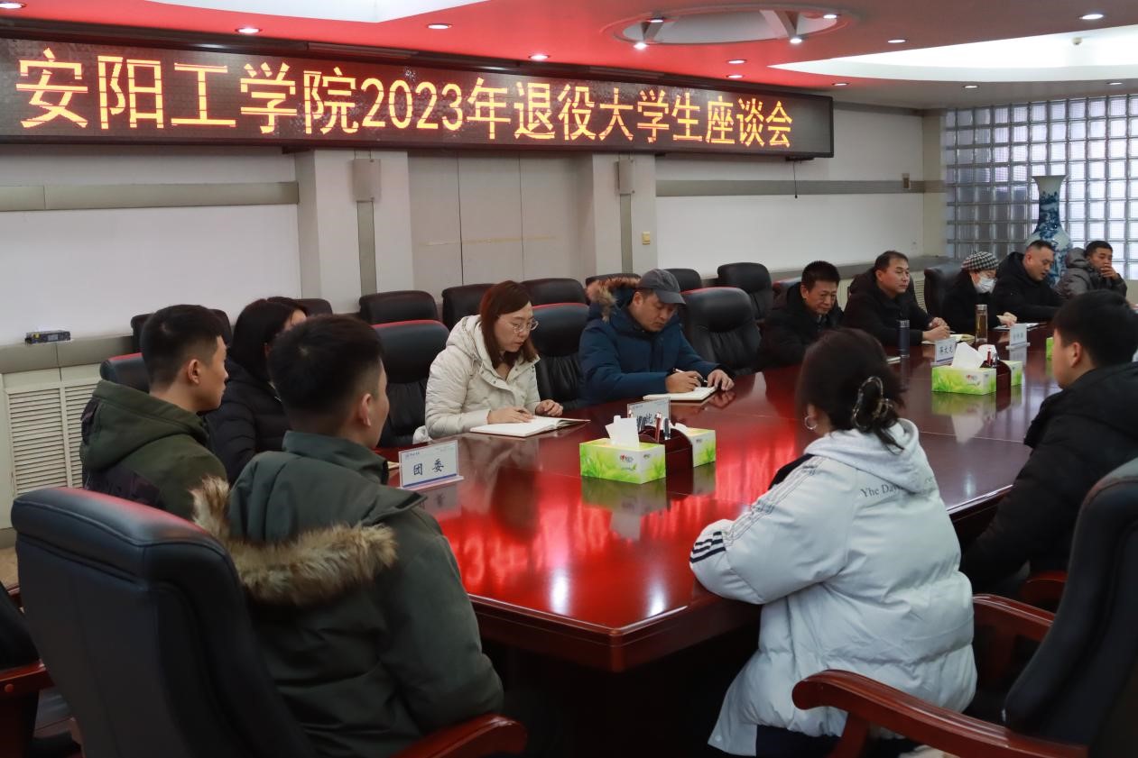 12月20日下午,yl7703永利2023年退役大学生座谈会在行政楼二楼会议室举行。副校长蒋文龙出席会议并讲话,宣传部、学生工作部、人民武装部、教务处、招生与就业指导处、团委部门负责人出席会议。人民武装部部长刘韶晖主持会议。