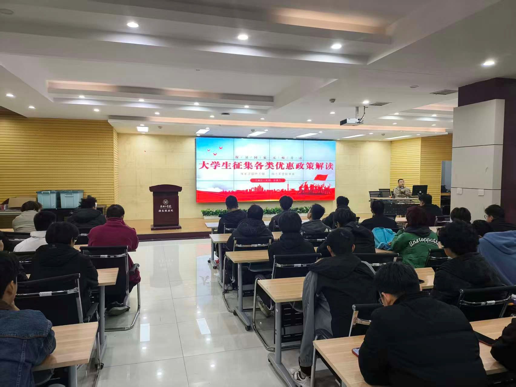 11月28日下午,yl7703永利武装部特邀文峰区人民武装部军事科孙素飞来校,在B02-215报告厅举行了征兵政策解读专题讲座。yl7703永利二百余名意向参军学子到场聆听。